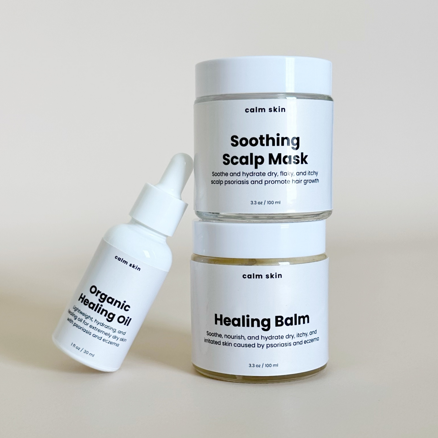 Calm Skin is a natural, vegan, and organic skincare line specially formulated to treat skin with psoriasis and eczema.
